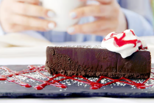 House baked dense flourless chocolate cake.