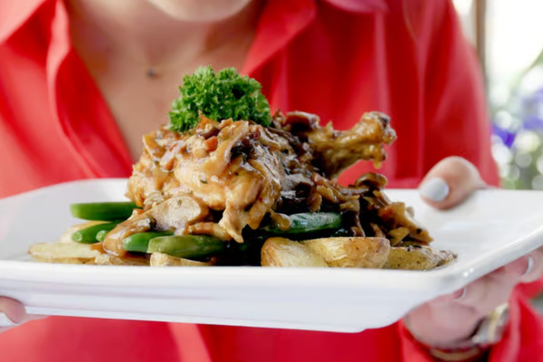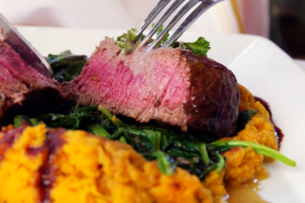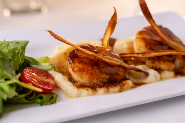 Pan-seared sea scallops served over a parsnip purée, veal truffle reduction. A refined blend of land and sea, rich in flavor and elegantly balanced.