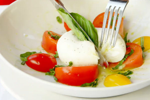 Creamy burrata cheese paired with vibrant heirloom tomatoes, fresh basil leaves, and a drizzle of extra virgin olive oil. A timeless Italian classic, elevated with rich, velvety burrata.